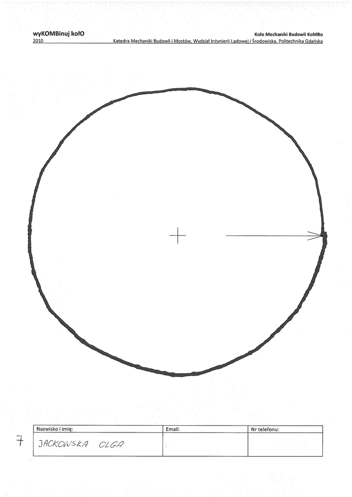 Na powyższym rysunku kolorem niebieskim zaznaczono zarys koła idealnego, kolorem czerwonym punkty koła uwzględnione w czasie obliczeń, natomiast kolorem czarnym koło narysowane przez zwycięzczynie.Skan koła